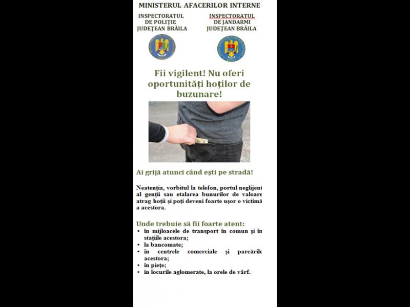 Oamenii legii intensifică în această perioadă activităţile de informare a cetăţenilor privind măsurile de prevenire a infracţiunilor contra patrimoniului, vizate fiind în mod deosebit zonele cu flux mare de cetăţeni.