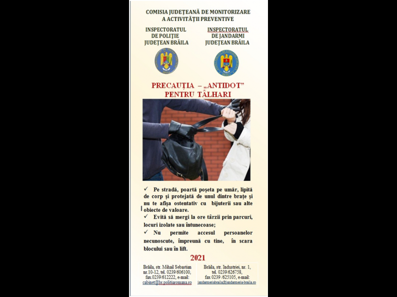 Un exemplu în acest sens îl constituie demersul comun al reprezentanţilor Inspectoratului de Poliţie Judeţean Brăila şi ai Inspectoratului de Jandarmi Judeţean Brăila care, în data de 6 decembrie, au oferit recomandări pentru prevenirea furturilor din genţi şi buzunare şi a tâlhăriilor, credincioşilor veniţi în pelerinaj la Biserica Sf. Nicolae din municipiul Brăila, cu ocazia zilei patronului spiritual al oraşului.