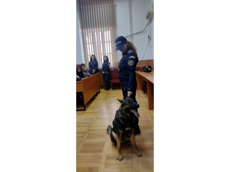 Activitățile au fost urmate și de un exercițiu demonstrativ al echipajului canin al Serviciului Criminalistic, specializat în depistarea de substanțe, elevii cunoscându-l pe câinele polițist Myke.